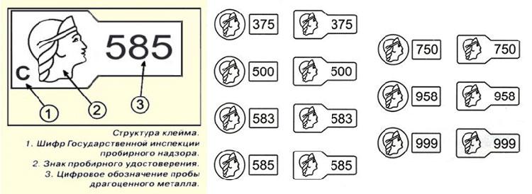 Для сплавов различной чистоты пробирная палата в России использует один и тот же вид клейма – женский профиль в кокошнике. Отличается только цифровое значение в соответствии с составом металла, на который наносится.