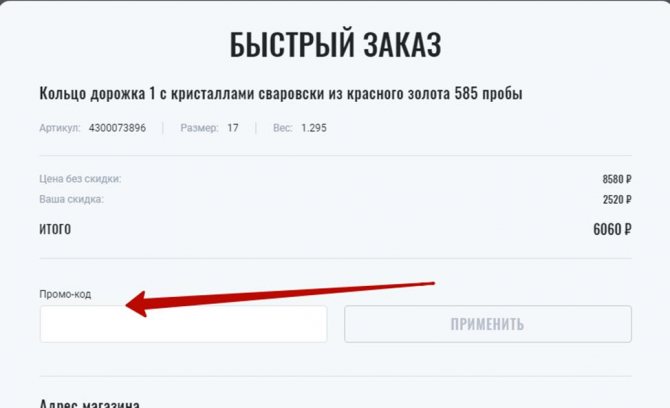 Если покупатель выберет быстрый способ оформления, при котором адрес доставки определен программой, поле для введения промокода будет находиться под списком выбранного товара.