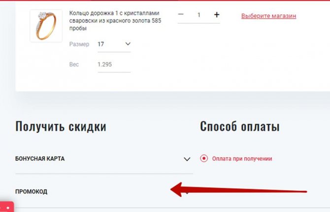 Если покупатель решит воспользоваться другим вариантом, при котором адрес получения товара он выбирает сам, промокод нужно будет ввести под фразой «Получить скидки».