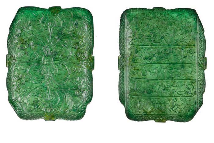 - Изумруд Великий Могол. Вес кристалла составляет 218 каратов, на камне выгравированы тексты молитв и цветочный орнамент. В 2001 году Могол был продан на аукционе за 2,2 млн долларов.