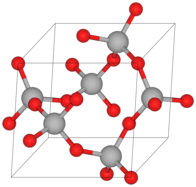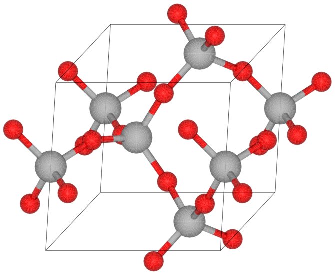 Кристаллическая структура β-кварца (красные шары — кислород, серые — кремний)