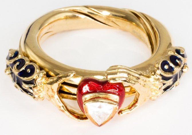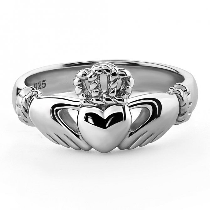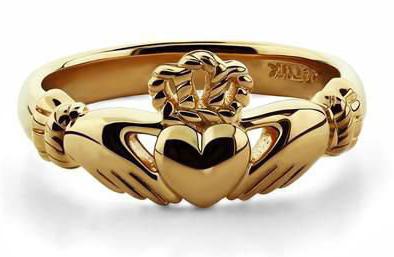 Необыкновенное кладдахское или, по-другому, ирландское золотое кольцо преподносят только в двух случаях выражения своих чувств — в знак любви, или в знак дружбы. Оно изготавливается в виде пары рук, которые держат одно сердце, увенчанное короной, где сердце символизирует любовь, а корона представляет чувство верности.