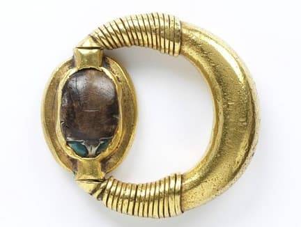 Известно, что древние египтяне носили кольца скарабея , вырезанные из различных камней, таких как ляпис-лазурь , аметист , горный хрусталь и бирюза , нанизанные просто серебряной или золотой проволокой . Они часто были выгравированы на плоской стороне скарабея с декоративными иероглифами, защитными символами или названиями; с простым поворотом функции и печатки и амулета были объединены. В период Нового царства (1559-1085 до н.э.) египетские ювелиры прогрессировали до отливки всех металлических стремя-образных колец подшипника царского картуша, Эти кольца служили не только как видимые символы звания и власти, но и как средство проверки подлинности документов. Египтяне носили кольца в качестве печатей или для религиозных и талисманских целей, и, хотя материалы были тщательно обработаны, и приятное расположение камней и рисунков очевидно, они носились с какой-то целью, а не просто как украшение.