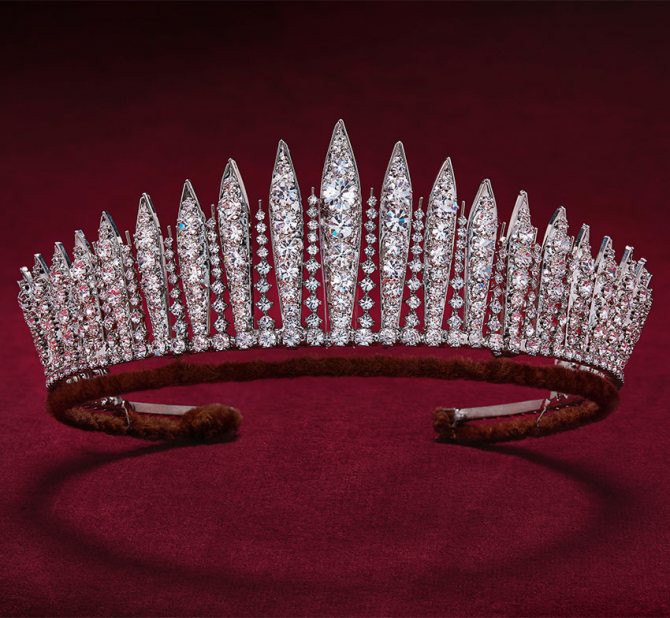 Речь идет о диадеме «Нимб» от Cartier. В 1936 году это украшение отец нынешней британской королевы, Георг VI, заказал у ювелиров для своей жены, Елизаветы Боуз-Лайон. В диадеме 739 бриллиантов круглой огранки и 149 бриллиантов огранки «багет». Вместе эти камни как будто образуют нимб над головой женщины, которая носит тиару.