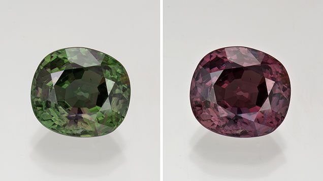 Шпинель и корунд не реагируют на магниты в отличие от александрита. Тот показывает слабую реакцию из-за наличия в составе примесей железа. К тому же синтетические аналоги и оригинал обладают разным плеохроизмом.