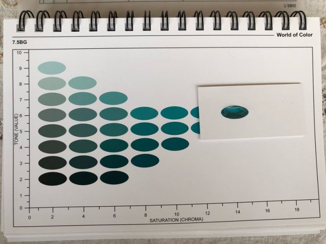Как говорилось выше, прежде всего определим цвет камня. Для этого открываем каталог с цветовыми таблицами и начинаем подбирать оттенок, соответствующий нашему апатиту. Предположим, нам идеально подошла страница 7.5BG, на пересечении строчки номер 5 и столбца номер 8.