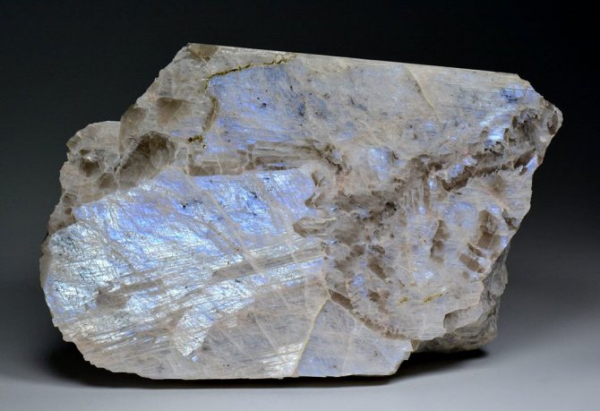 Беломорит также известен как лунный камень и является подвидом полевого шпата, а такое название самоцвет получил из-за специфического оптического эффекта. Его обладающее рассеянным нежно-синим оттенком сияние похоже на свет Луны. Но это не иризация, а адуляресценция, которая вызвана рассеиванием белого света на дефектах камня. А вот в ультрафиолетовом свете беломорит проявляет слабую оранжевую люминесценцию.