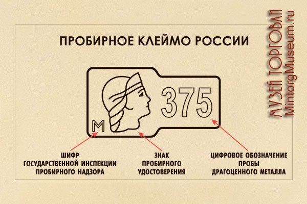 Структура пробирного клейма, установленная с 1994 года в России для изделий из драгоценных металлов.