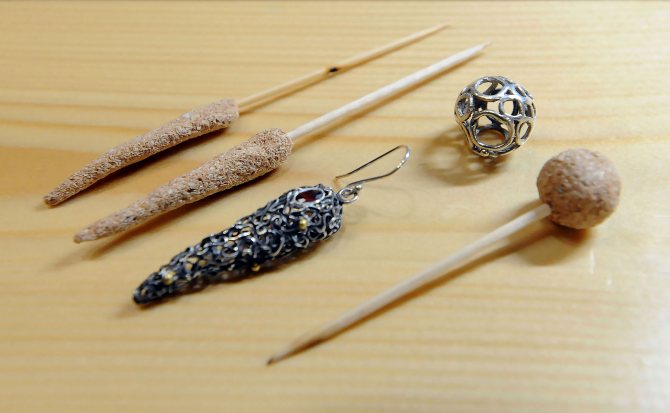 Для создания объемных изделий можно воспользоваться жидким серебром в шприце. На пробковую основу шприцем выдавливается серебряная паста. В процессе обжига эта основа сгорает, и вы получаете полую серебряную бусину, аналогичную тем, которые создавались мастерами серебряного дела сотни лет назад и назывались «филигрань».