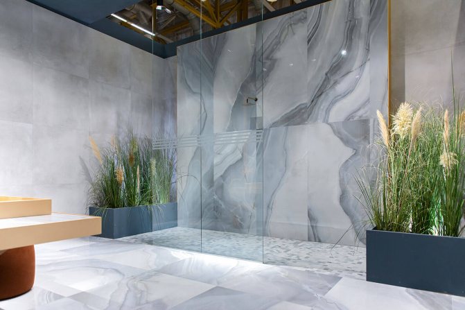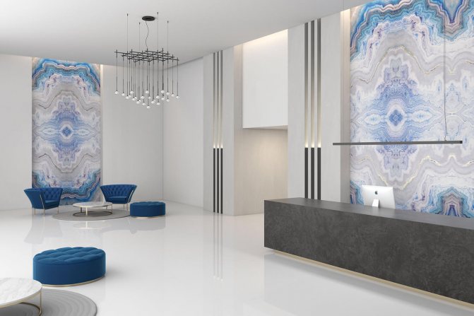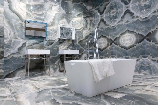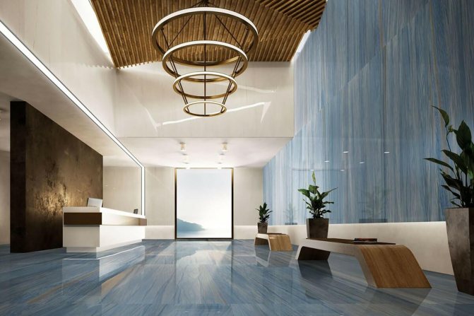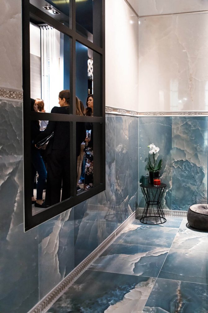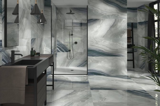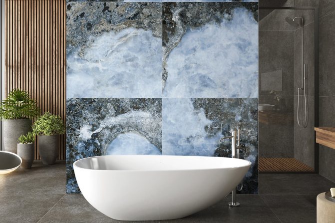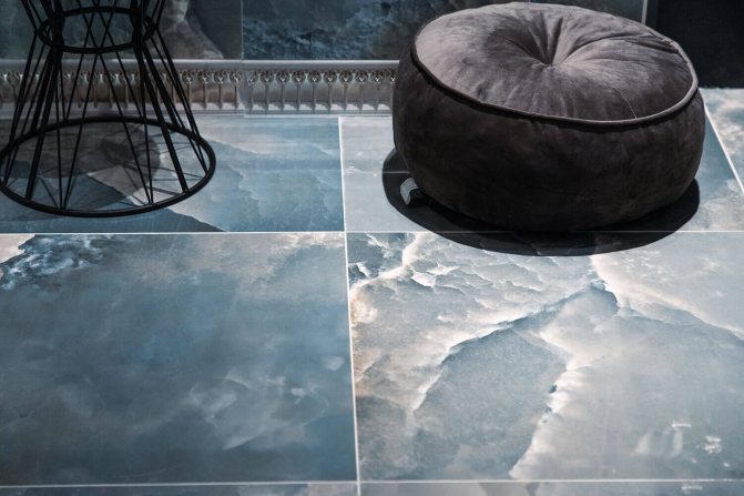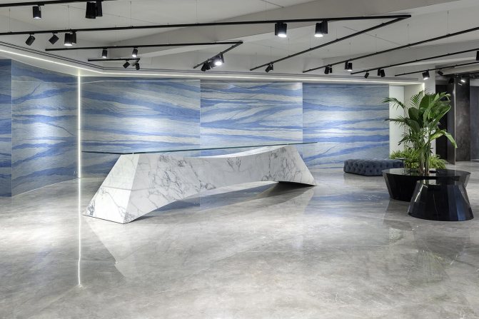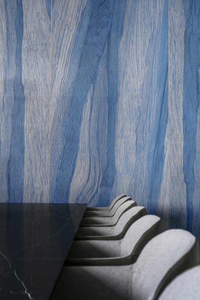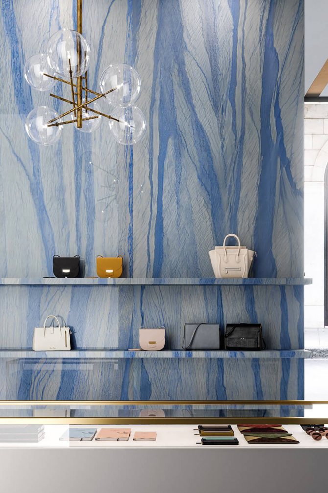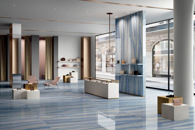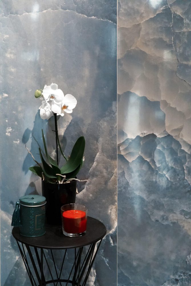 Воспроизведение цветного камня в керамической плитке – яркий тренд последних лет. Оттенки голубого цвета часто встречаются среди новинок производителей. Наиболее популярной является имитация агата, оникса, а также бразильского мрамора Azul Macaubas. Кроме того, современные технологии позволяют создавать уникальные дизайны, которые не встречаются в природе, как например, «калакатта» с голубыми прожилками, или сочетание рисунков агата и оникса на одной плитке.