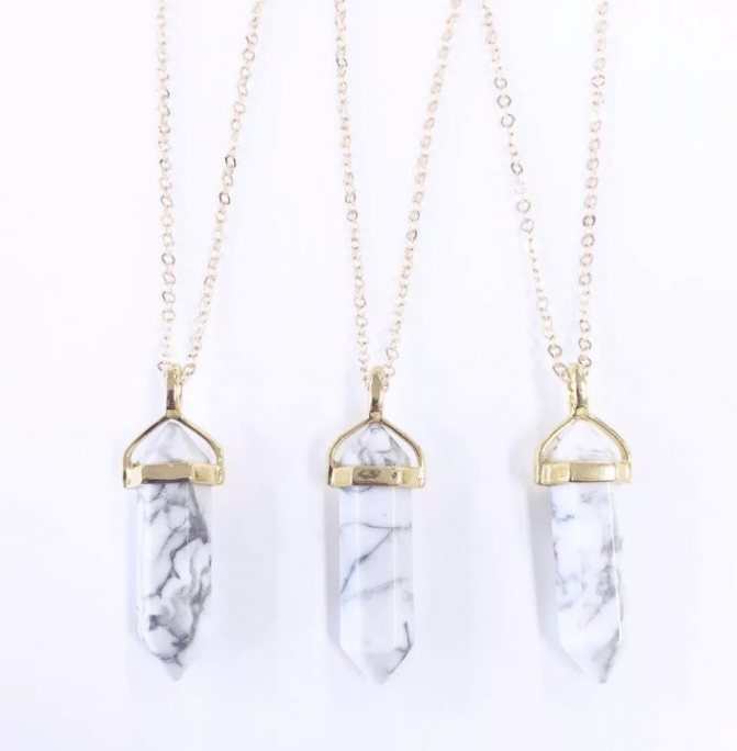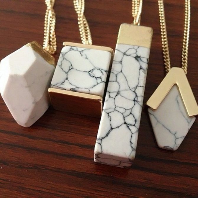 - Серьги в виде трилистника из желтого мрамора и серебра можно приобрести за 30 долларов, кулон из черно-белого камня в бисере – за 25, кулон голубых оттенков в виде черепа дракона из мраморной крошки – всего за 5, винтажное колье из крупных серо-белых кусочков – за 11, а браслет из темных серо-коричневых бусин – за 12 долларов.