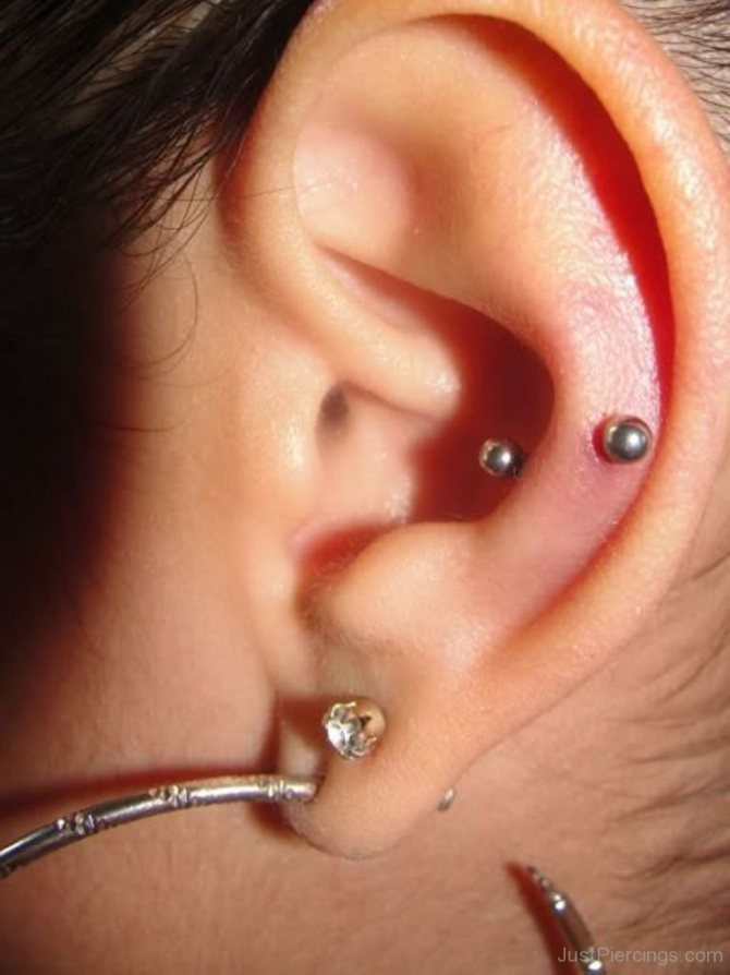 Такой пирсинг уха делается на части хряща, который находится непосредственно над отверстием ушной раковины. Пирсинг этой части смотрится очень аккуратно и симпатично, так как хрящик в этом месте очень тонкий и короткий.