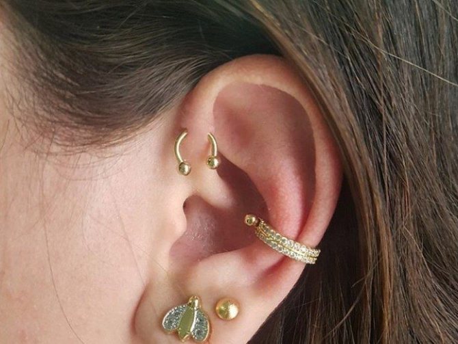 Пирсинг раковины уха выполняется в хряще уха, но только не сверху, а примерно посередине. Вид такого пирсинга смотрится эффектно и нежно. Сережки для такого вида пирсинга уха выбираются средних или маленьких размеров.