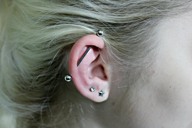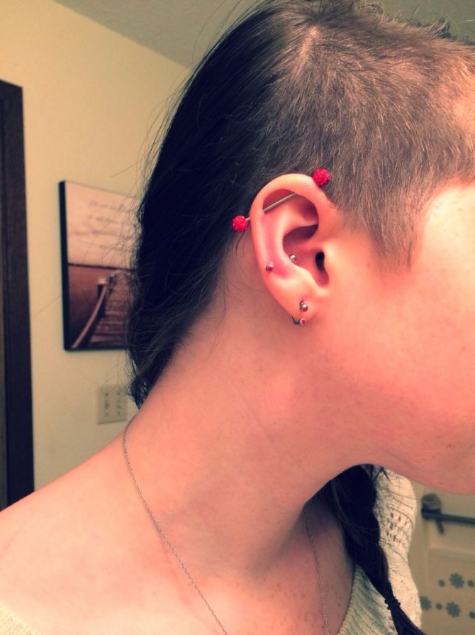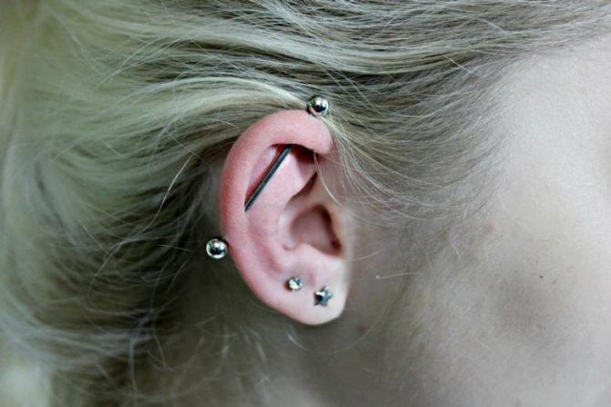 Хотите получить оригинальное украшение уха, тогда выберите индустриальный пирсинг. Такой пирсинг выполняется вверху уха. Металлическая штанга проходит через отверстия хряща в верхней части уха. Смотрится очень эффектно!