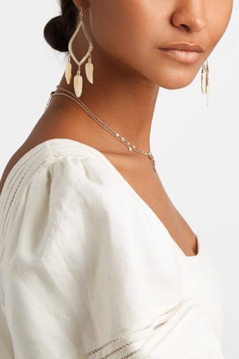 - Круглое лицо зрительно сузить помогут серьги-капли или украшения с кистями. Чтобы убрать излишнюю округлость, подвески должны иметь заметную декоративную деталь приблизительно на уровне середины шеи.