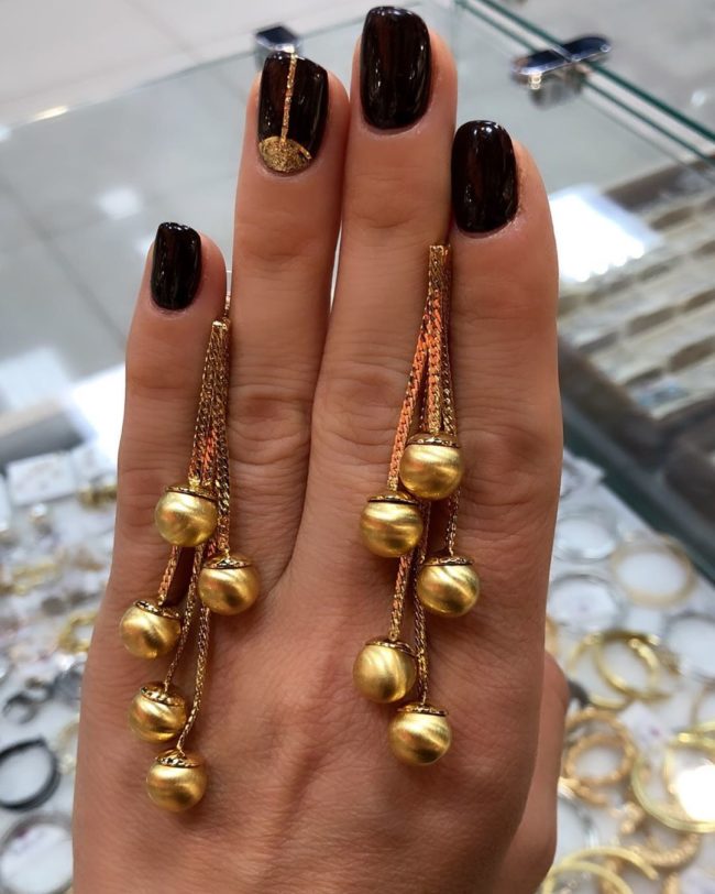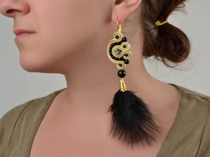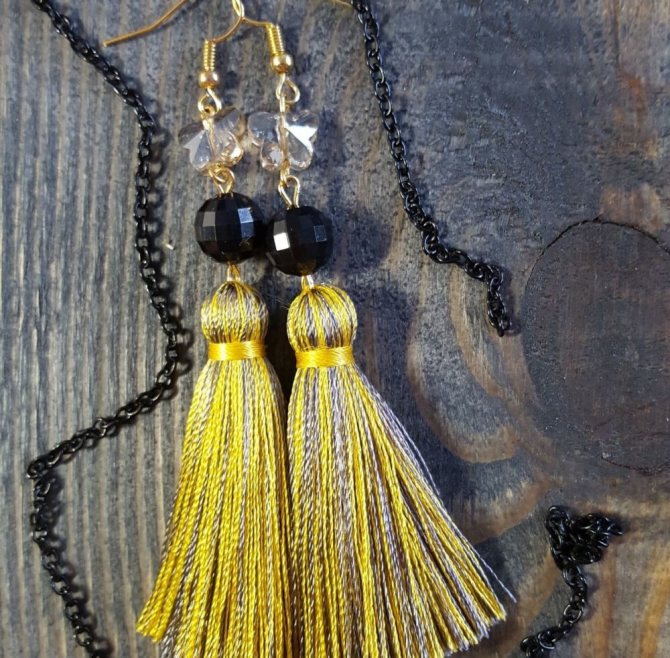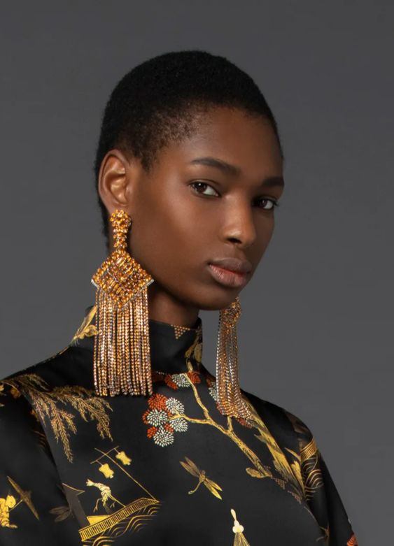 Очень стильный вариант, который моментально сделает вас звездой вечеринки. Роскошные серьги из золота, украшенные бахромой, станут красивым дополнением лаконичному черному платью и высоким лодочкам на каблуках. А еще такие серьги подойдут девушкам с короткой стрижкой, так как замечательно подчеркнут скулы и овал лица.