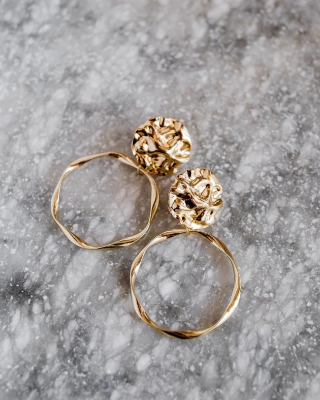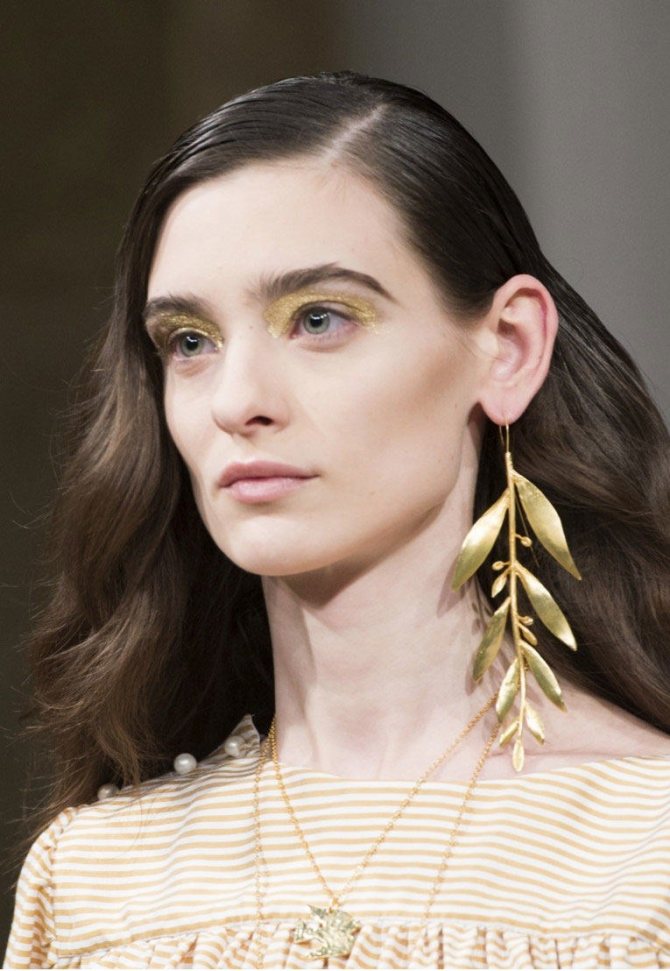 Самый горячий тренд, который вдохновил многих дизайнеров. Украшения, словно из расплавленного металла, мгновенно привлекают внимание. Они не обязательно должны быть массивными, подойдут изделия скромных размеров, чья фактура напоминает фольгу или текучее золото. Лучше всего такие акцентные серьги смотрятся с однотонной одеждой простых форм или с открытыми плечами.