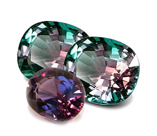 Александрит представляет собой разновидность хризоберилла. Поражает его уникальное свойство менять цвет в зависимости от времени суток или ракурса. При дневном освещении он имеет голубовато-зеленый оттенок, при свете искусственном освещении становится красным и даже пурпурным. В другом ракурсе самоцвет может приобретать темно-синий, фиолетовый тон, а иногда сияет желтым или коричневым цветом. Такой эффект хамелеона имеет большую ценность в ювелирных украшениях.