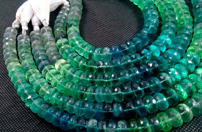 Градиент на ткани, а соответственно и в одежде – еще одна модная тенденция. А если так, то самоцвет должен занять достойное место в ваших нарядах и в шкатулке с драгоценностями. Цена флюорита позволит это сделать. Камень обрабатывают чаще в виде кабошонов.