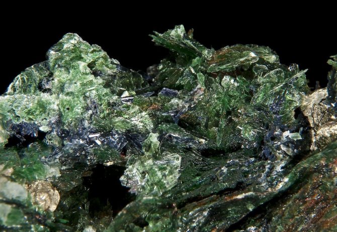Это прежде всего слюда, которая по характеристикам соответствует слоистым силикатам. Содержит высокое содержание многих примесей, но хрома больше всего, от 4%.