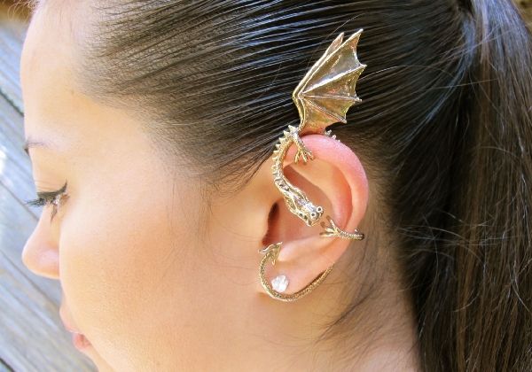 Ну и не стоит забывать о том, что далеко не каждая форма ушей предполагает ношение крупных серёжек. Если каффы увеличивают размер ушных раковин за счёт своей массивности, ширины или обилия декора, то их не стоит носить женщинам с большими или оттянутыми вперёд ушами. В этом случае лучшим решением станет аккуратное небольшое или соединённое тонким перешейком украшение.