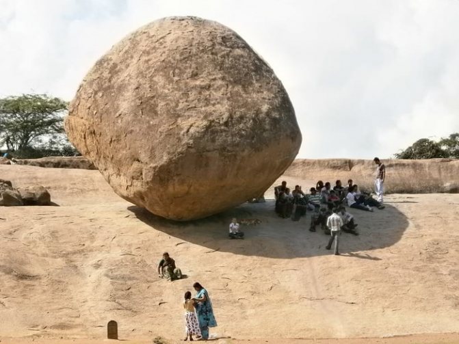 Индусы называют этот камень «Масляный шар Кришны». Согласно легенде, это не что иное, как кусок сливочного масла, который создал бог Кришна и оставил на склоне холма. Этот загадочный камень не качается, и его не смогли сдвинуть с места 9 слонов, несмотря на то, что он соприкасается с поверхностью очень малой площадью, да и сама точка опоры расположена на склоне. Устойчивость этого камня не вызывает никакого сомнения у местных жителей, и они часто спасаются от палящего солнца под его тенью.
