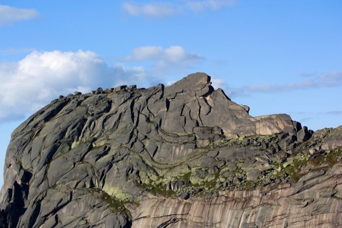 Такую интересную форму имеет гряда под названием Спящий Саян. Этот горный хребет очень напоминает силуэт человека, который лежит на спине, а руки сложил на груди. Издалека хорошо прорисовывается лицо, волосы, руки каменного исполина. Интересным фактом является то, что человеческий силуэт просматривается с любой стороны. Поэтому с давних пор люди гадали и спорили о происхождении этого памятника природы. И придумывали разные легенды и мифические сказания не только про Спящий Саян, но и про другие камни, своими очертаниями что-то напоминающие.
