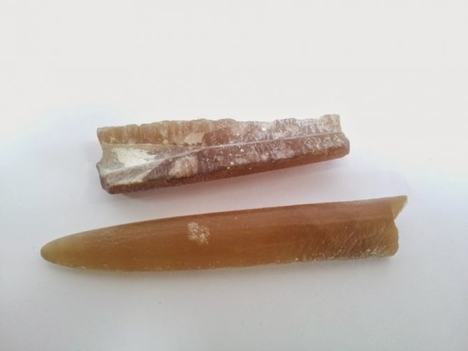 - Белемнит серо-голубого оттенка. Камень содержит углеводород, который влияет не только на цвет, но и на кристаллическую структуру камня.