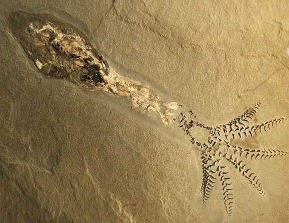 Палеонтологи взяли эти окаменелости и использовали их для создания идеального портрета древнего двустворчатого моллюска: голова, тело и десять щупалец, снабженных присоской. Это современный кальмар. За одним примечательным исключением — внутренней оболочки, от которой эволюционные потомки избавились. Белемниты — одна из трех частей этой раковины, рострум, который помогал моллюску сохранять равновесие при движении.