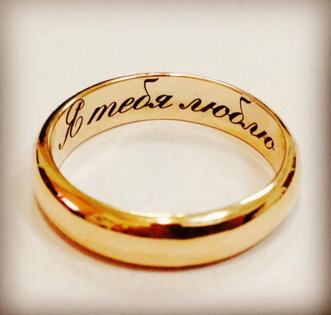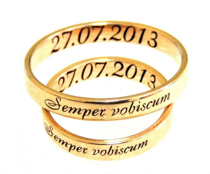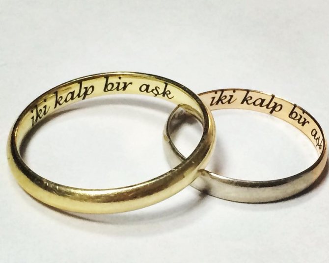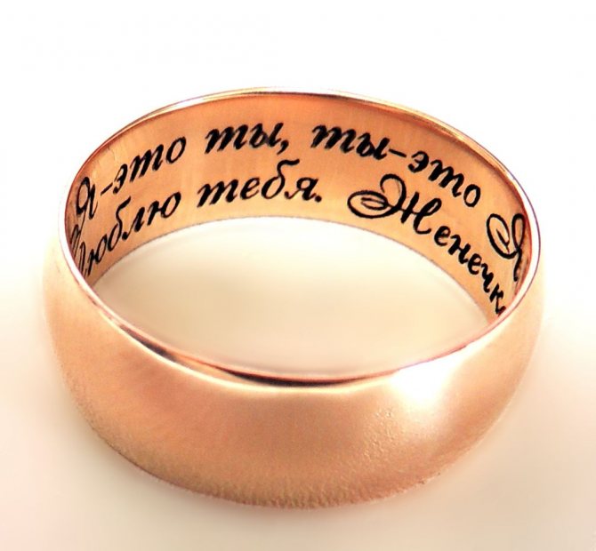 Надпись может делаться и на внутренней, и на внешней стороне изделия. Наиболее распространен первый вариант, поскольку выгравированные фразы являются очень личными для супругов. Особенно это актуально тогда, когда начало слова находится на одном кольце, а его продолжение – на другом. Делать надпись на внутренней стороне удобно и потому, что она меньше подвергается воздействию факторов окружающей среды. Это позволяет ей долго сохраниться в идеальном состоянии.