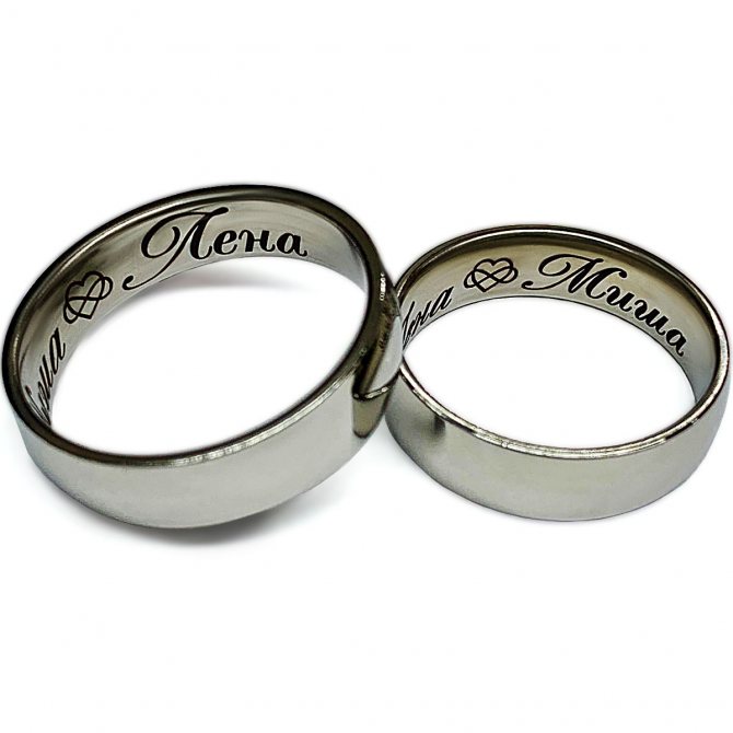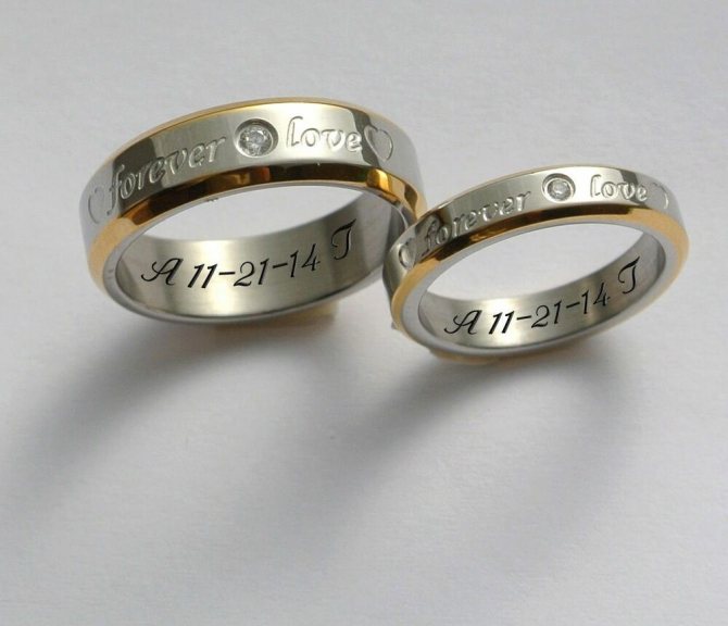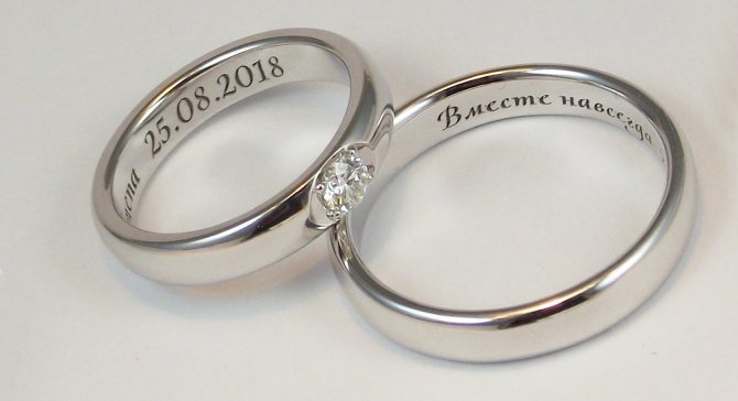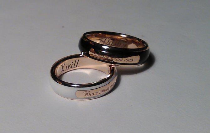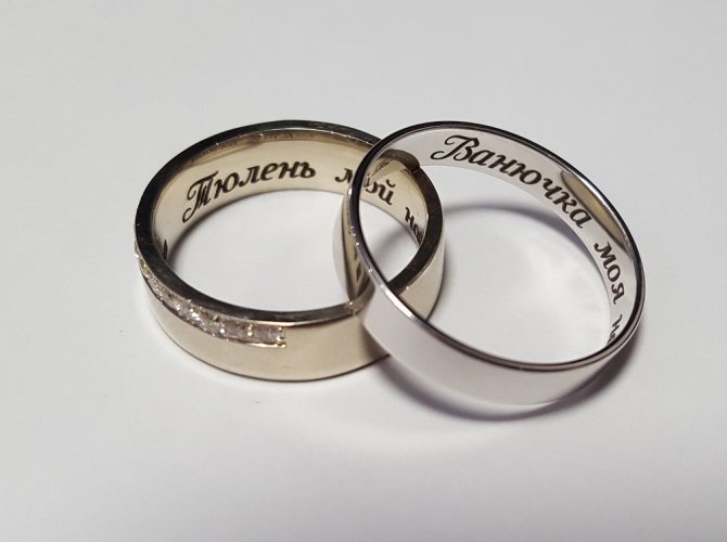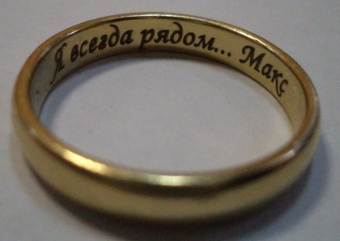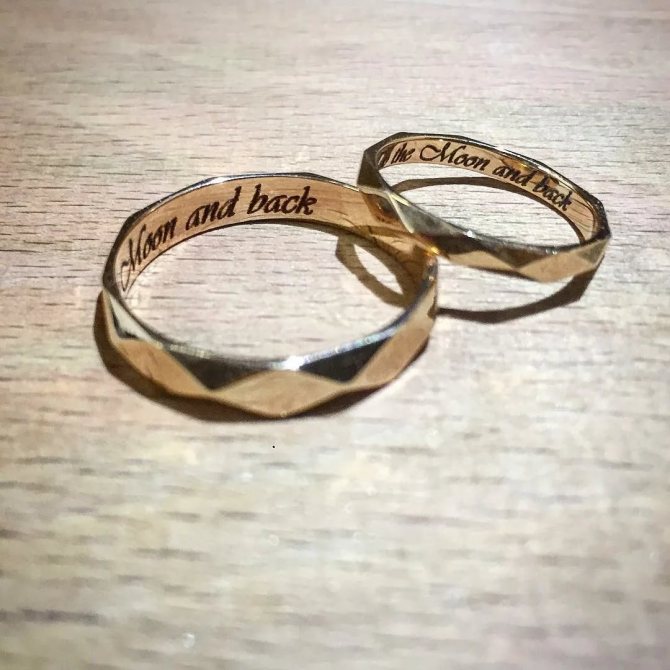 Гравировку можно наносить на внутреннюю и внешнюю сторону колечка. Первый вариант пользуется большей популярностью. Ведь часто молодожены заказывают очень личные фразы, не предназначенные для чужих глаз.