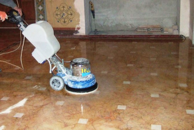 . После термического воздействия на гранитную плиту образуется шершавый верхний слой, на котором чётко виден рисунок породы. Перепад высот варьируется в пределах от 2 до 5 мм. Таким образом обрабатывают гранитные ступени, переходы. - Шлифование