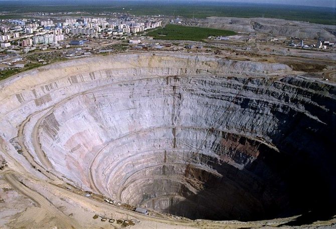 Шахта «Мир» – место, вызывающее благоговейный трепет, и сейчас она занимает второе место по величине вырытой скважины на Земле. Она настолько велика, что пролет над шахтой запрещен из-за сообщений о засасывании в шахту воздушных судов из-за отклонений температуры и давления вокруг скважины. Ее диаметр составляет почти 1,2 км, а глубина – более 500 метров. Рудник сыграл очень важную роль в развитии алмазной промышленности.
