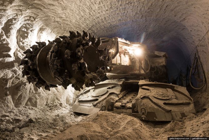 Подземные машины оснащены мощными насадками, имеющими металлические шипы, которые врезаются в горную породу и дробят ее