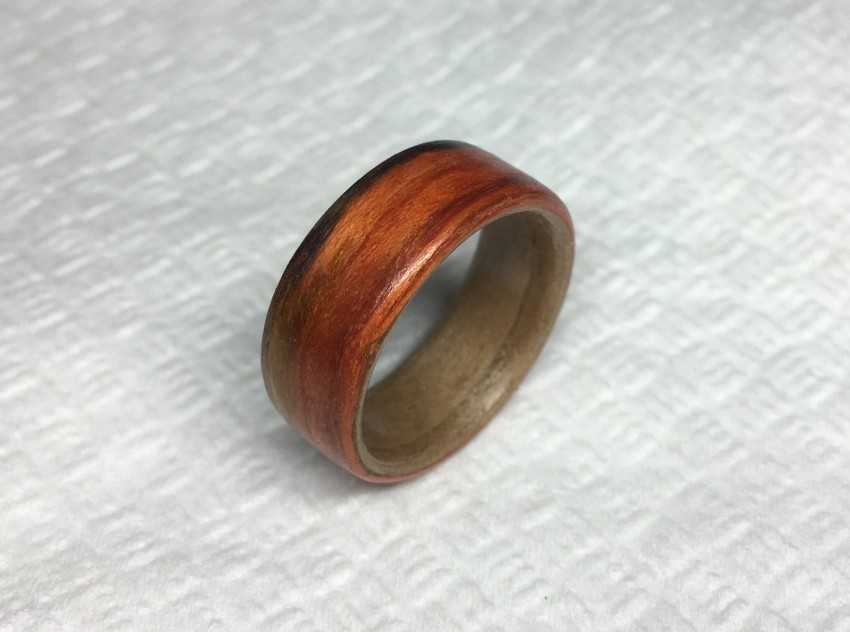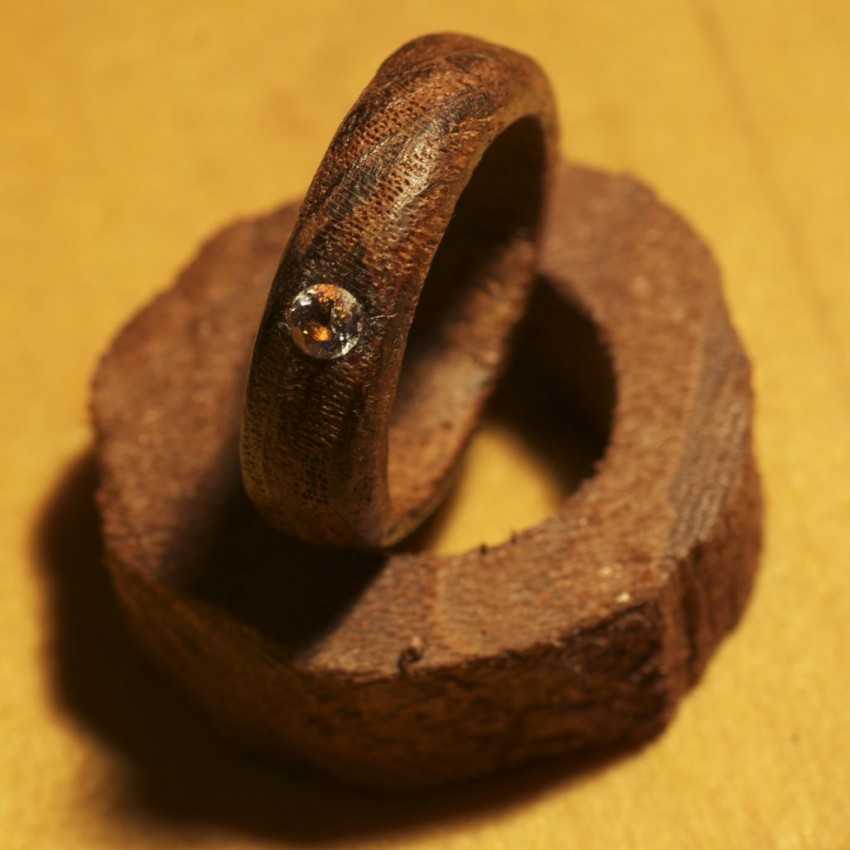 Чаще всего на рынке можно встретить деревянное кольцо с эпоксидной смолой. Украшение может быть выполнено в двух вариантах. В первом случае фрагменты материала просто добавляют в жидкую смолу для формирования узора. Во втором мастера изначально изготавливают деревянное кольцо, которое затем обрамляют слоем эпоксидки.