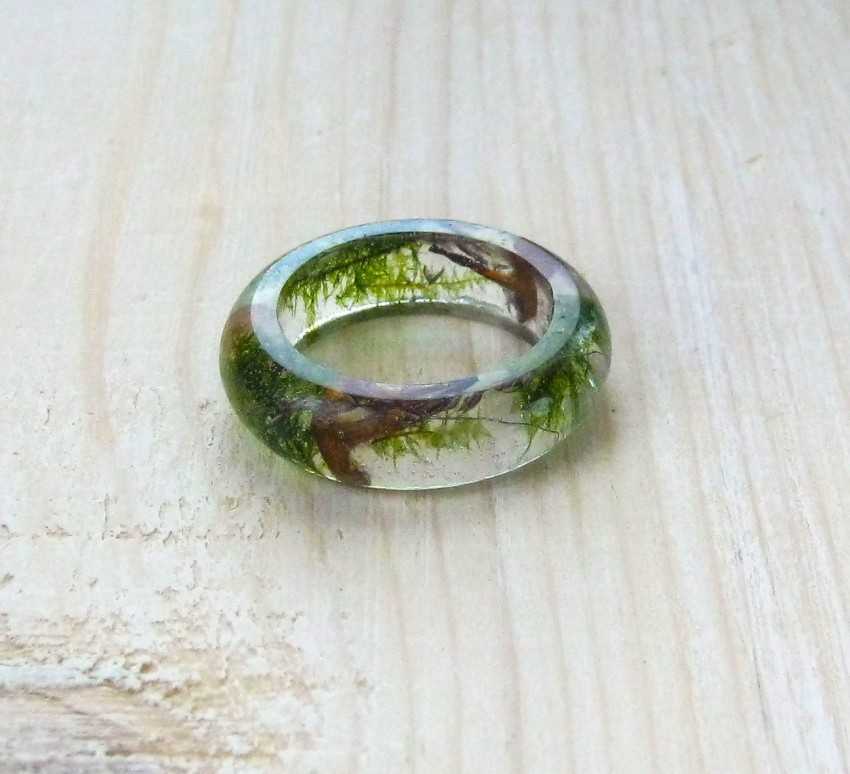 Не менее популярно кольцо из смолы с цветами. Поскольку этот аксессуар небольшой, в его производстве редко используют реальные лепестки. Чаще это просто рисунки из той же смолы или заранее изготовленные фигурки из глины и других материалов.