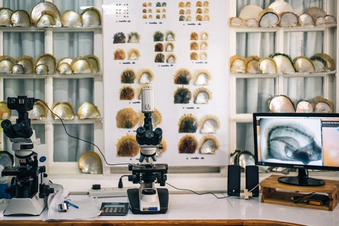 Прежде чем вырастить жемчужину, нужно вырастить саму устрицу. Сначала морские биологи организовывают условия для размножения моллюсков. Затем следят за ростом зародышей и снабжают их едой: крошечные, еще полупрозрачные устрицы должны питаться секретным коктейлем из фитопланктона, чтобы вырасти в особей с особенным перламутром золотистого оттенка. Готовые к открытой воде и жизнеспособные юные устрицы в лабораторных цистернах перевозит прикрепленный к ферме вертолет. Если это все еще звучит слишком просто, учтите, что на заре существования Jewelmer морские биологи проделали колоссальную работу, чтобы вывести сорт устриц с золотистым перламутром.