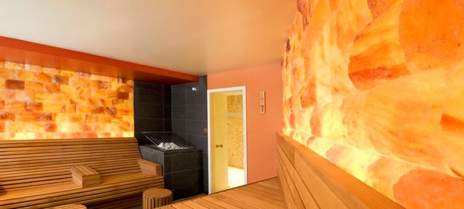 Для удешевления варианта отделки бани плитами из гималайской соли можно ограничиться фрагментарным декорированием стен. Лучше всего применять этот материал в отделке предбанников, а не парных. В них значительно проще поддерживать необходимую для сохранения целостности материала влажность.