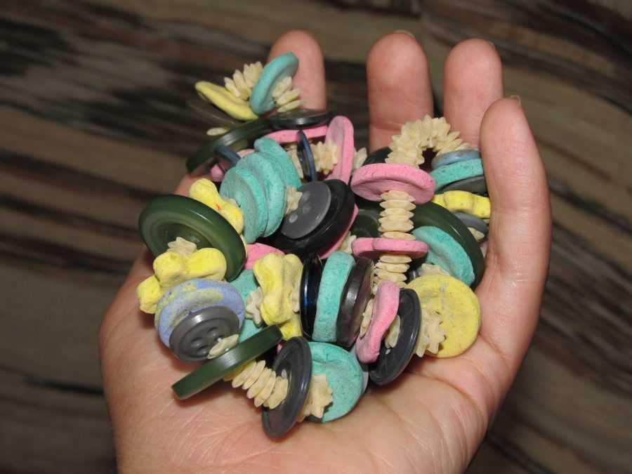 Ингредиенты нужно смешать до состояния пластичной массы, скатать шарики, проделать в них отверстие для нити и оставить сохнуть на несколько дней. Ускорить процесс можно, поставив изделие в духовку.