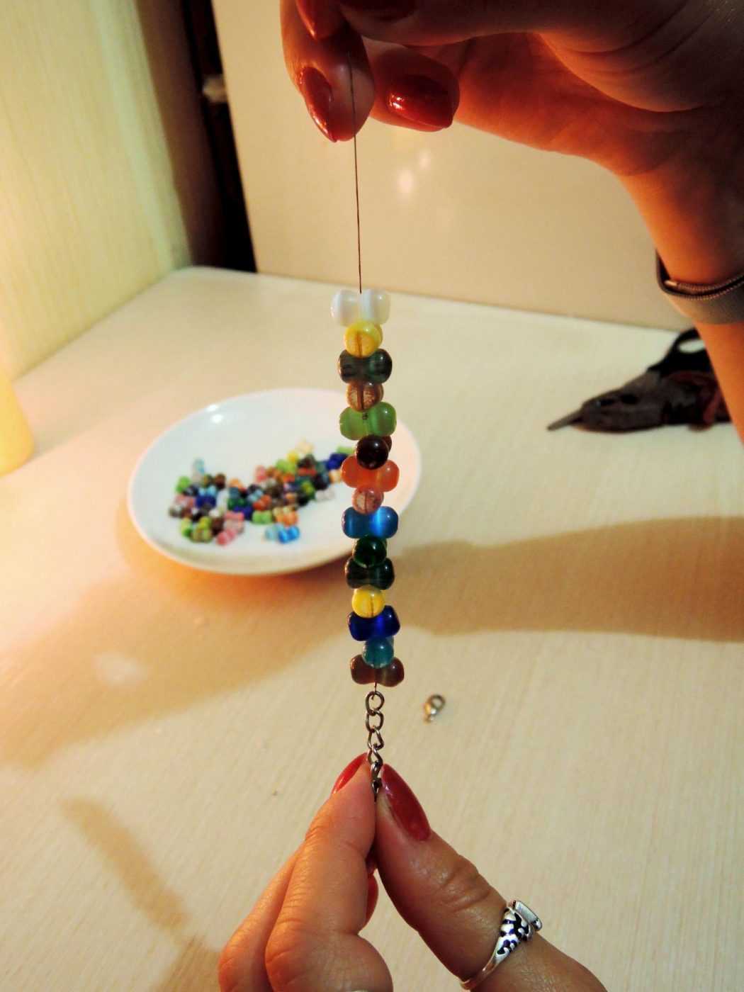 - Не обрезая леску до нужной длины, нанизайте бусины в нужном порядке;