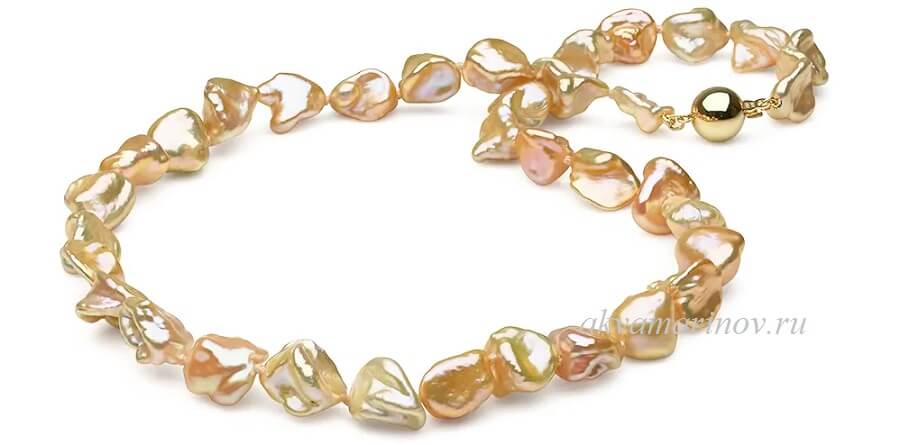 Жемчуг кейши выращивается в форме боба. При этом толстый слой перламутра имеет неровные стенки.
