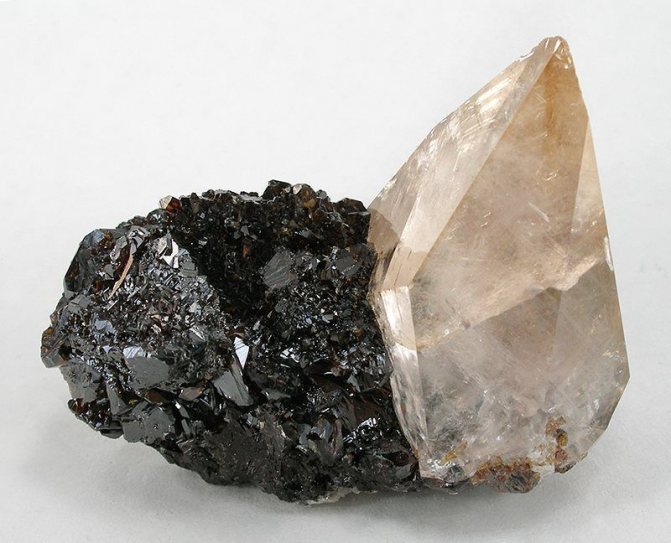 - Желто-коричневый кристалл кальцита, прикрепленный к кластеру кристаллов черного сфалерита.