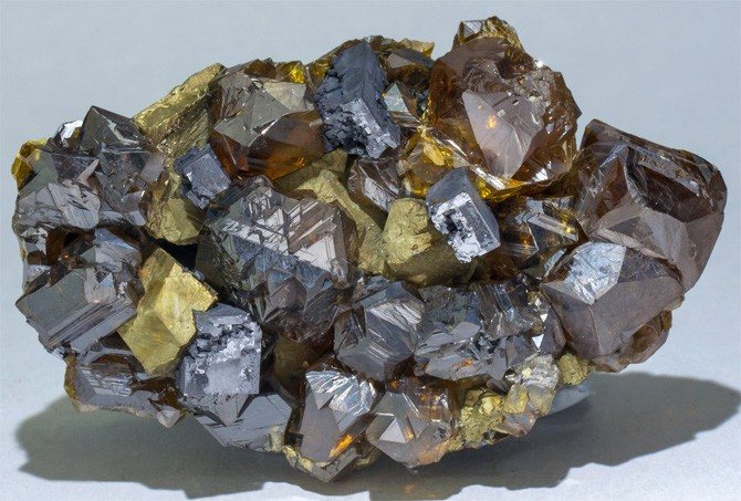 - Острые тетраэдрические кристаллы сфалерита с незначительным ассоциированным халькопиритом из шахты Идарадо, Теллурид, округ Орей, Колорадо, США