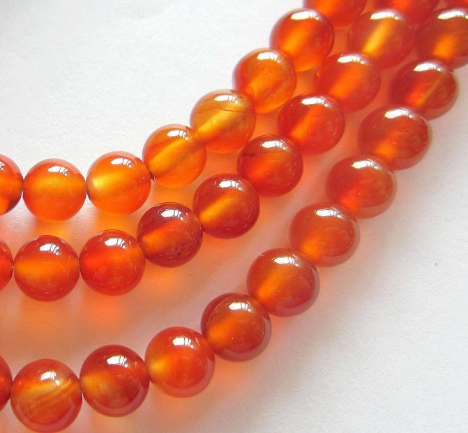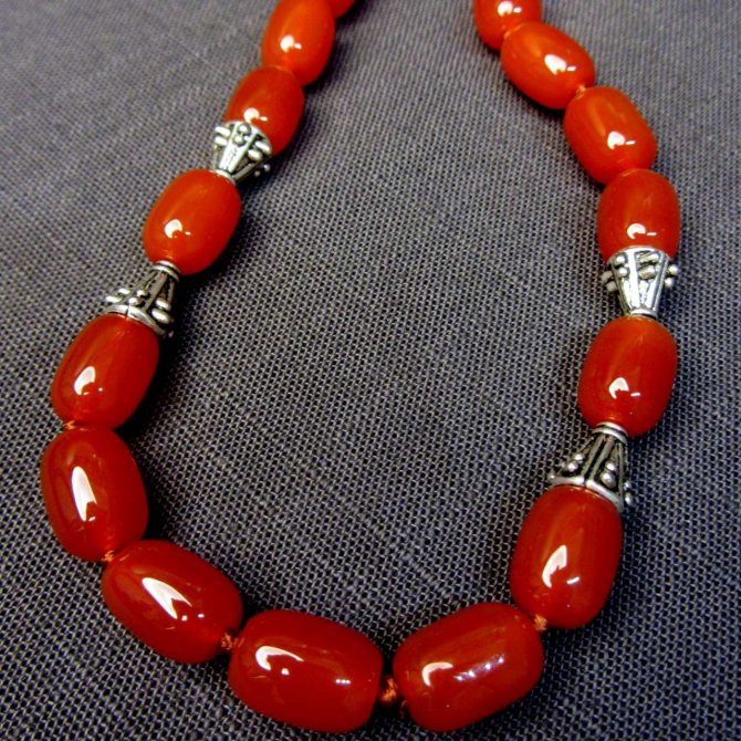 - Стеклянные. Приобретая серебряное колье или четки из карнеола обращайте внимание на блеск. У стеклянных экземпляров он будет таким же стеклянным, у натурального камня – восковый с матовым отливом.