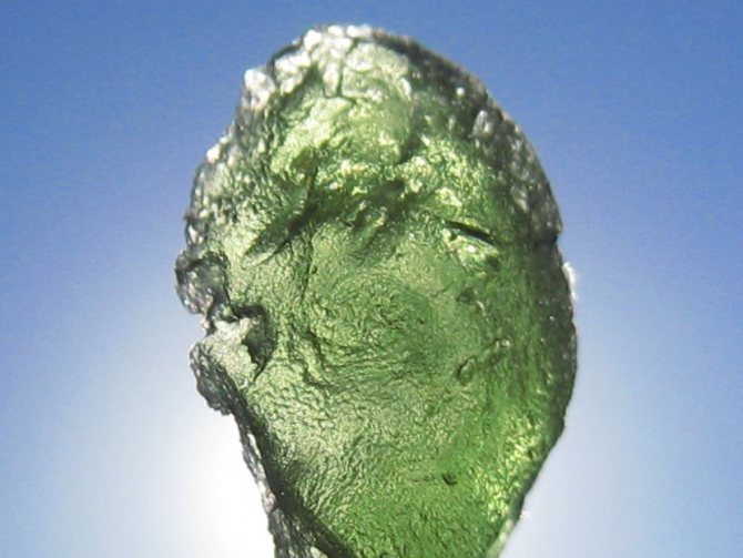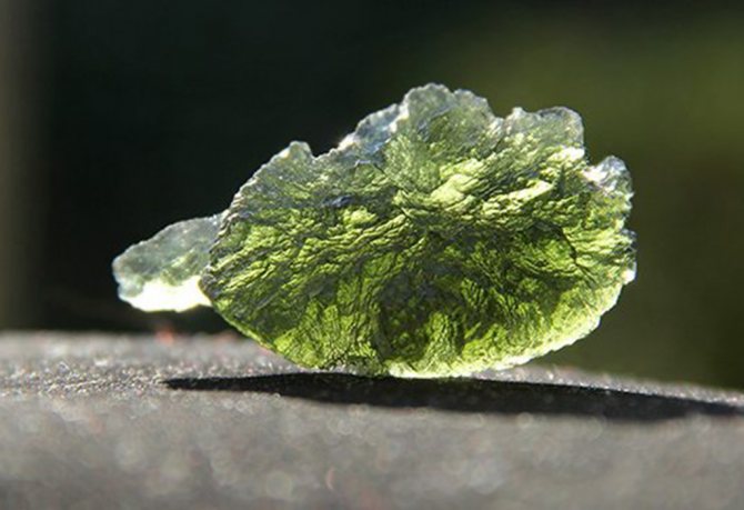 - Упавший метеорит воздействовал на горные породы. После удара порода расплавилась и появилась кинетическая энергия, которая и выбросила ее на поверхность. Кусочки породы разлетелись в разные стороны. Камни стали называть молдавитами (пришельцы с неба). Данная теория объясняет структурированную форму камня, так как другие самоцветы имеют целостный внешний вид. Столкновение метеорита с Землей и образовавшийся взрыв привели к тому, что минерал имеет небольшой размер – до 3 см. Поверхность – исцарапанная.