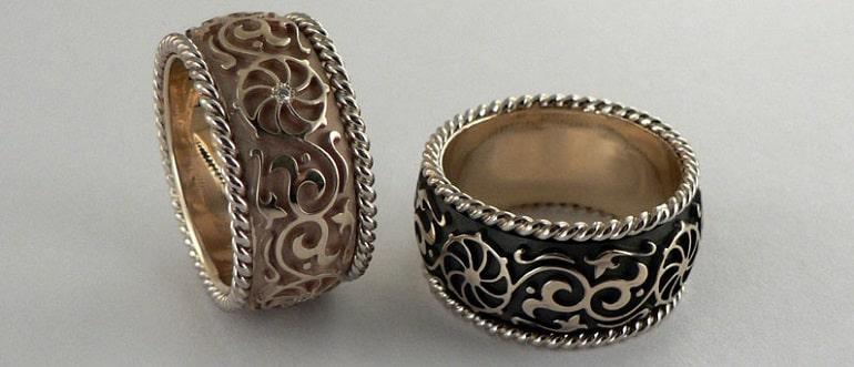 Прекрасно, богато, утонченно смотрятся золотые колечки с нанесенным черным родированием, отделанные темными бриллиантами. Такой технологический процесс доступен немногим и довольно трудоемкий, что значительно увеличивает стоимость таких украшений.