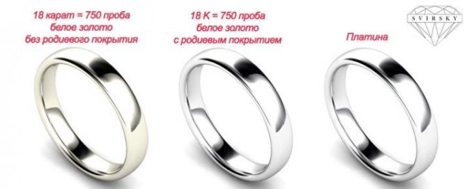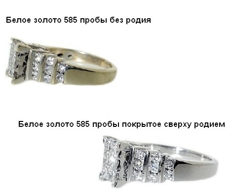 - Серебро, покрытое родием, отличается от платины по тем же признакам, что и от белого золота.