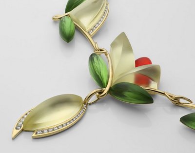 «Серия «Цветочные ожерелья» пришла ко мне из наблюдения за природой, где жизнь растений, в частности, представляет собой абсолютное совершенство дизайна и функциональности. Чтобы достичь того, что я себе представляю, я использую стекло, которое состоит из минералов, чтобы иметь палитру цветов, смесей, прозрачности и фактур поверхности, подходящих для каждого изделия. Моя цель состоит в том, чтобы спроектировать и построить пригодный для носки объект неизменно высокого качества, который полностью принадлежит мне и является уникальным в истории ювелирных изделий».