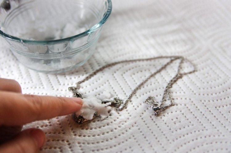 Украшения, состоящие из мелких звеньев и других элементов, нужно очищать очень аккуратно. Не стоит прибегать к механической чистке, лучше обратиться к помощи профессиональных составов — растворов, салфеток, пены, полироли. Подручные средства (аммиак, сода и соль) также эффективны и безопасны.