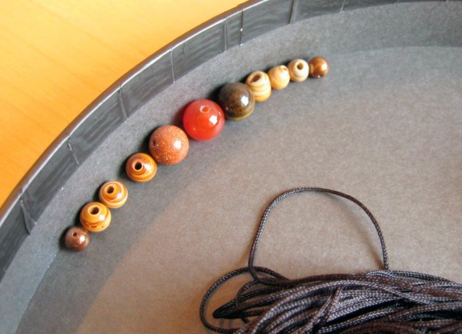 Необходимо сначала измерить сантиметром размер своего запястья и купить шнур длиною в 4 раза больше размера запястья, т.к. необходим запас на узелки, также понадобятся 9 больших бусин разных цветов и 2 бусины поменьше на завязки.